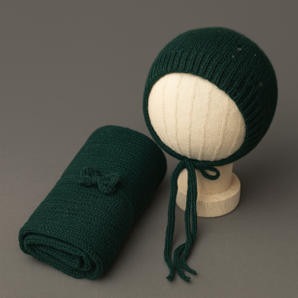 Kit com Wrap, Touca e Headband, todos feitos em lã de tricô macia e confortável para o bebê. Com excelente elasticidade e fácil de enrolar, além de proporcionar ainda mais suavidade e delicadeza ao ensaio.