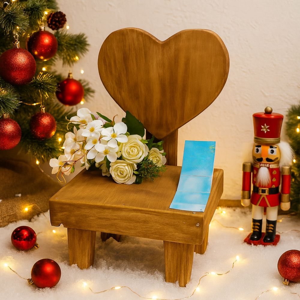 Uma linda cadeirinha reforçada, feita em madeira, com encosto em formato de coração. Medindo 24 cm de largura no assento e 35 cm de altura total, ela pode ser usada com bebê de até pouco mais de 1 ano.