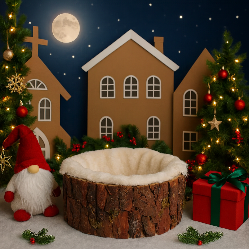 Feita em madeira, com casca de árvore natural aplicadas na superfície externa . A parte interna é lisa e segura para o bebê, podendo ainda receber mantas, pelos ou layers para efeitos ainda melhores.